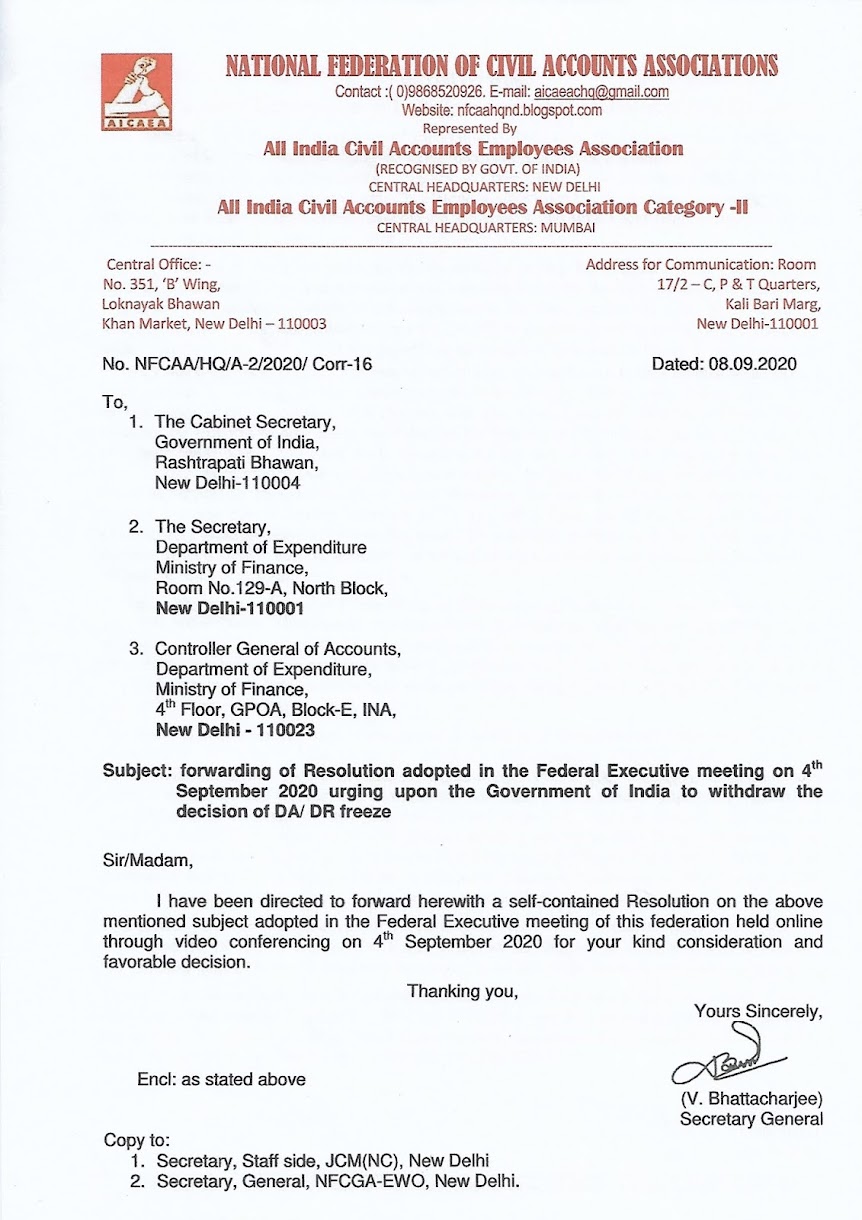 It has been decided by the Federal Executive meeting that, there shall be Branch wise Day long Dharna on 6th October 2020 maintaining social distancing. Branches of Delhi shall sit for Dharna in front of CGA office.